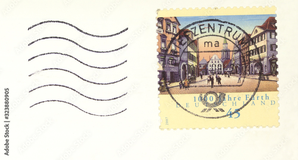 Briefmarke stamp Deutschland Germany 1000 Jahre Fürth frankiert gestempelt used Stadt Häuser Kirche Straßw alt old 45