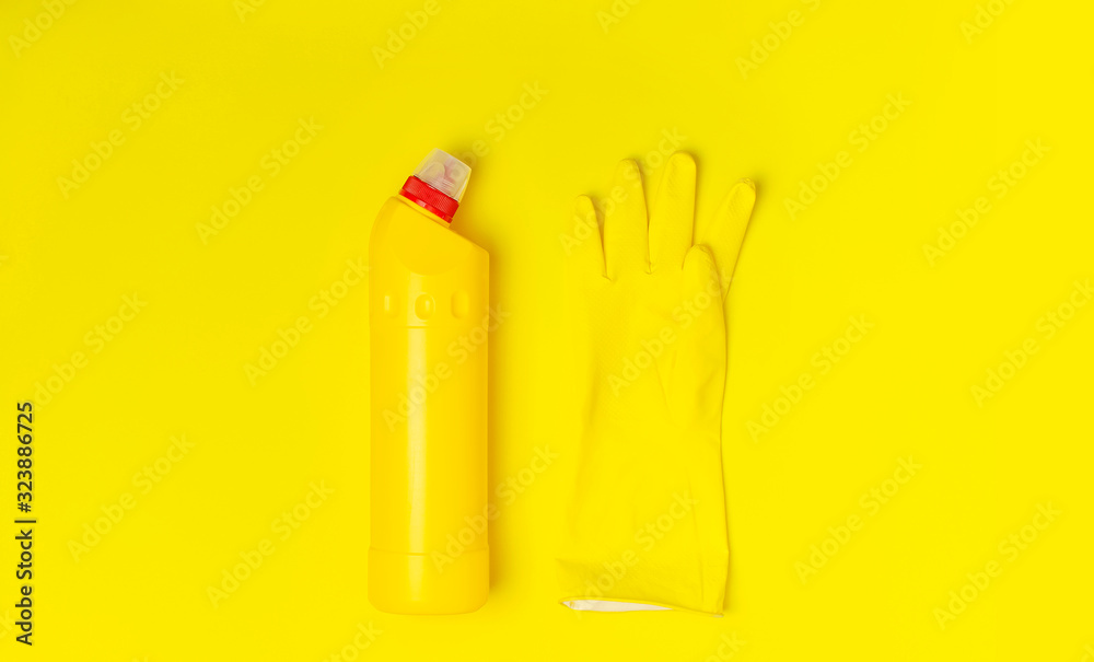House cleaning concept. Household chemicals, disinfectant, bleach, antibacterial gel, yellow rubber gloves, sponge, rags on yellow background. Flat lay top view copy space. Cleaning accessories