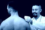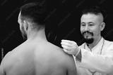 Reflexologist hand with acupuncture needle near the shoulder man. Treatment of a man’s body with Chinese medicine methods. Needles on a black background close-up