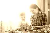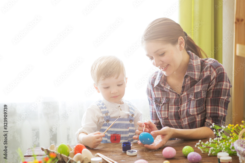 Happy time while painting easter eggs. Easter concept. Happy mother and her cute child getting ready for Easter by painting the eggs