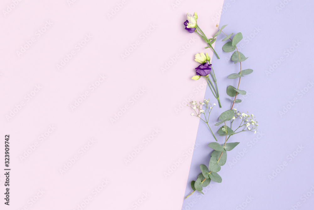 Frame made of eucalyptus, eustoma and gypsophila flowers. Floral composition on a purple background.