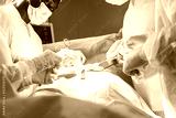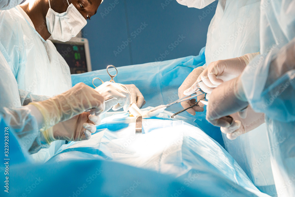 An international team of doctors performs a complex surgical operation on a patient under anesthesia. Modern operating room and experienced surgeons save lives