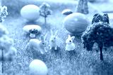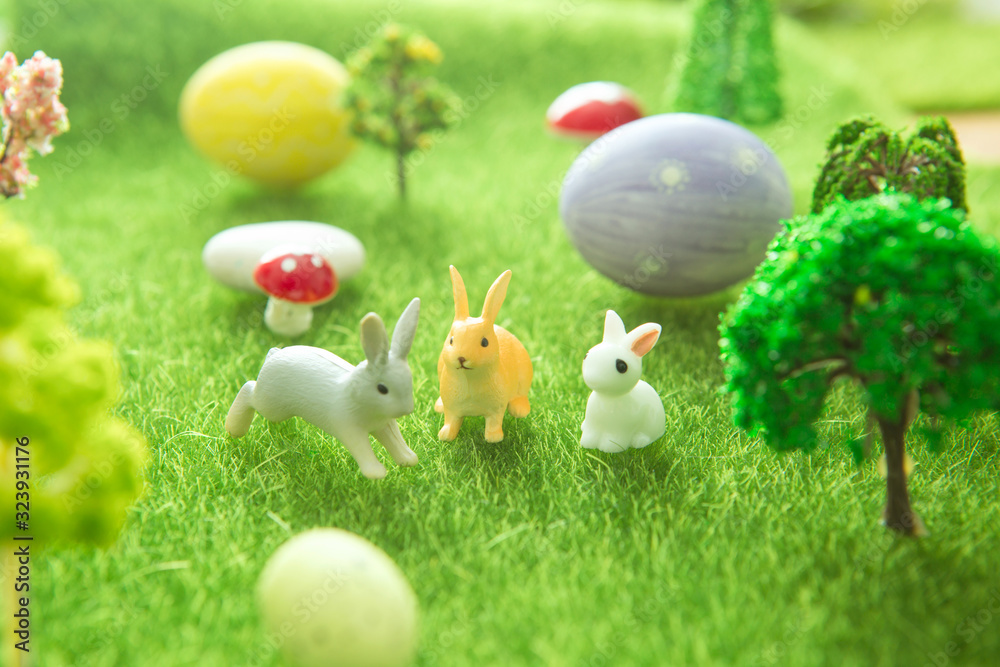 Little Easter bunny toys and Easter eggs on green grass. Fairy tale