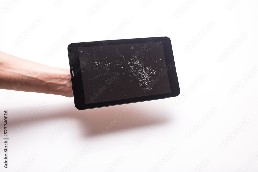 Black broken tablet on a white background. Cracked gadget screen. The guy holds a broken tablet in his hand.