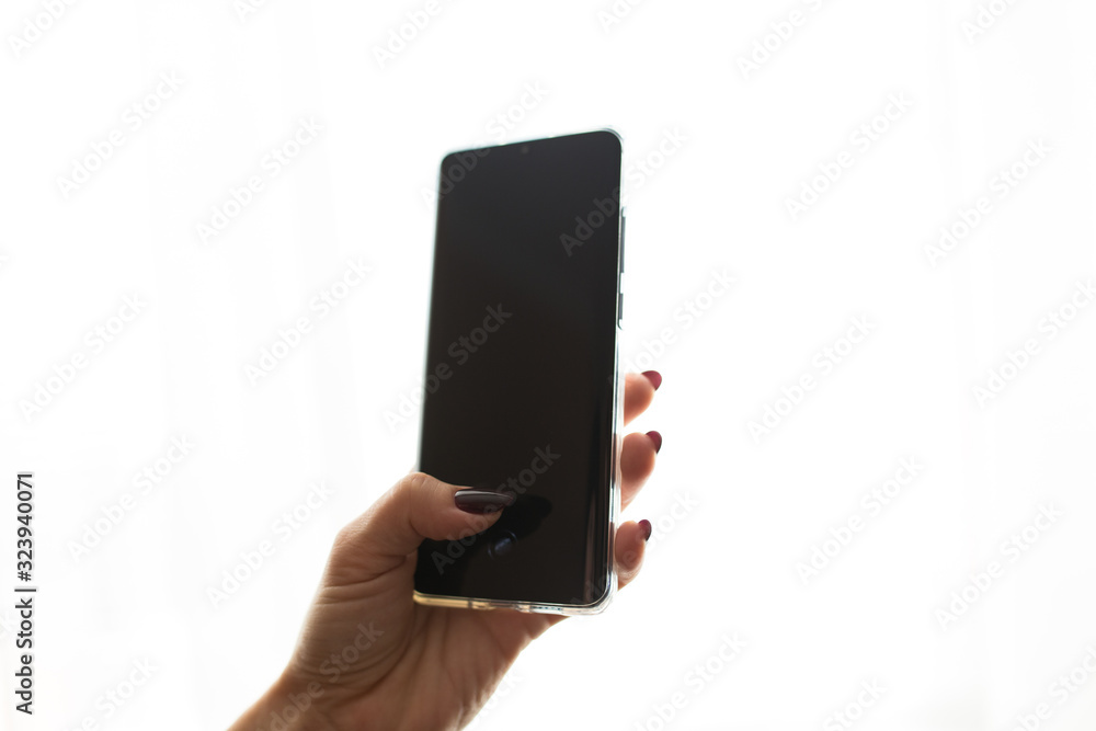 Mobile phone with a black screen on a white isolated background.