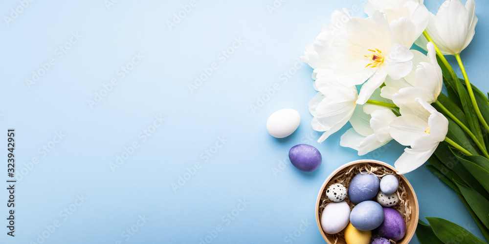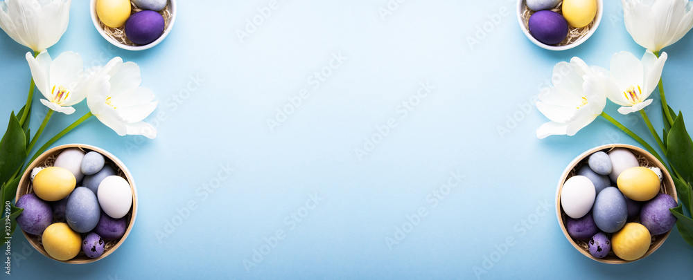 Naturally colorful dyed Easter eggs on blue background. Happy Easter holiday theme, banner