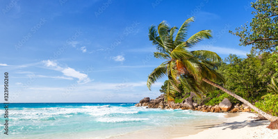 Seychelles Anse Georgette beach Praslin island palm panoramic view vacation paradise ocean sea
