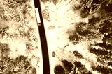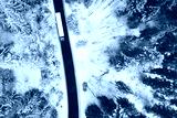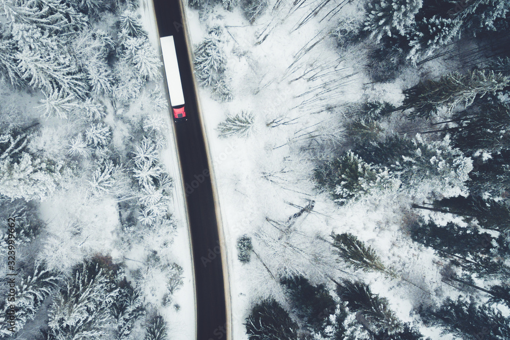 Aerial drone view of semitrailer truck and lorry drive along the road through the winter forest. Transportation on icy road.