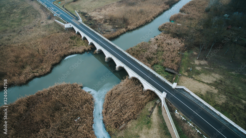 Drone shot of the nine arched bridge in hungarian national park.