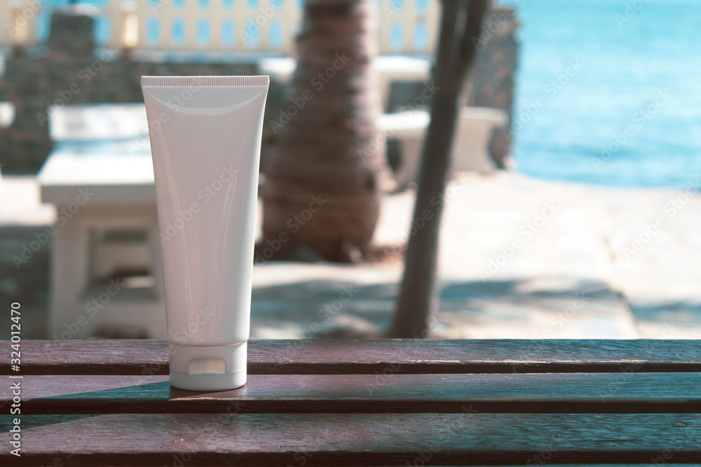 beauty treatment medical skincare and cosmetic lotion cream serum oil mockup bottle packaging product on stocn rock sea beach nature background, healthcare and medicine concept