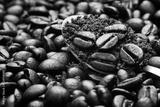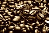 closeup dark brown roasted coffee beans background and coffee powder above spoon