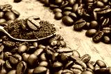 roasted coffee beans background and coffee powder above stainless steel spoon