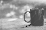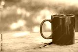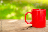 a red coffee cup or coffee mug with steam on an old dark wooden table