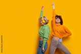 Two gorgeous caucasian girls dancing on a yellow background while listening to music through headphones