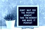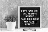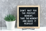 Don't wait for the perfect moment, take the moment and make it perfect. Motivational quote on letter board, succulent flower and glasses on table. Concept inspirational quote of the day