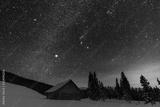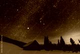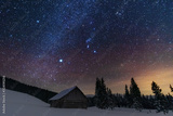 A bright starry night in the mountains with the Milky Way in the sky, Venus and millions of stars highlighting beautiful mountain huts in the valley.