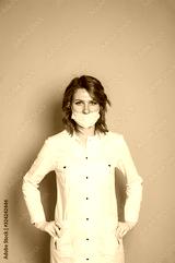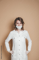 Doctor in white robe with medical mask on a brown background. Coronavirus.