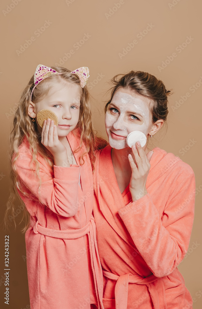 Portrait of mother with her small daughter wearing bathrobes, with round cookies and cosmetics wipes.