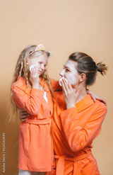 Young woman and her little daughter in red bathrobes cleans faces with a cotton pad and lotion.