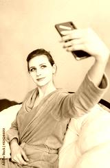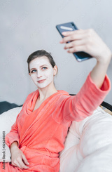 Beautiful woman in a red robe, taking selfie, relaxing during beauty procedures at home.