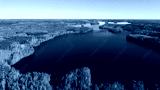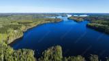 Blue lake, islands and green forests from above on a sunny summer day. Lake landscape in Finland.