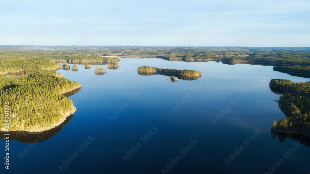 Blue lakes, islands and green forests from above on a summer evening. Aerial view of beautiful National park Kolovesi in Finland.