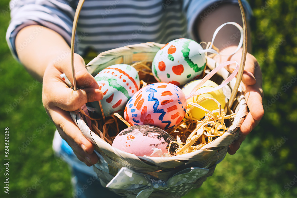 Colorful Easter eggs in basket. Kids hunt for eggs outdoors.