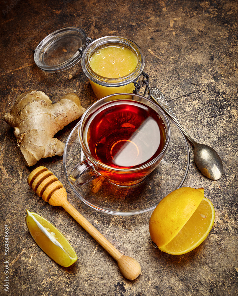 Cup black tea with ginger honey and lemon on metallic surface top view. Still life of hot therapeutic drink from cold.