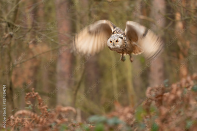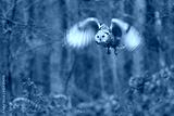 Siberian eagle owl fly in the forest. Longer time exposure with motion blured wings