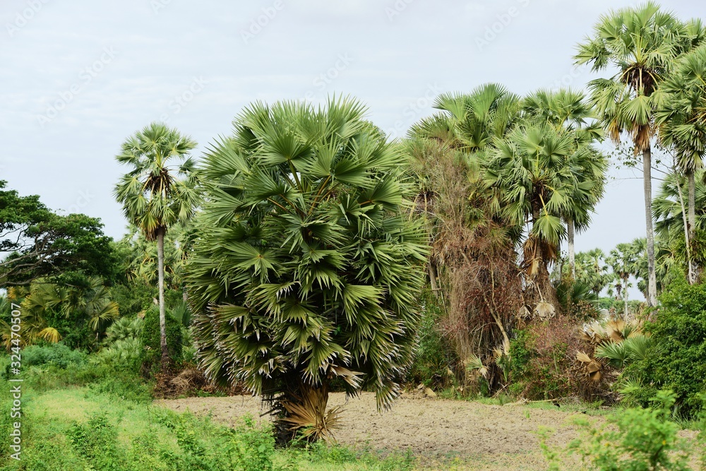 View of sugar palm and green rice fields.