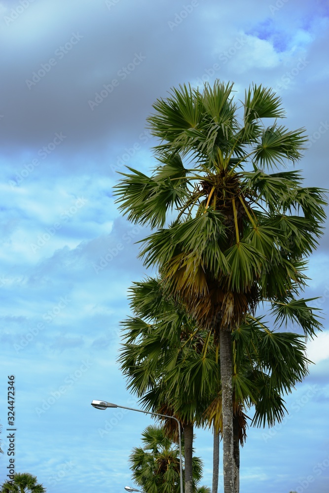 View of sugar palm and green rice fields
