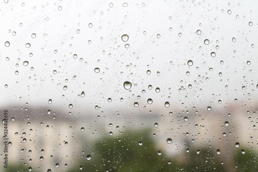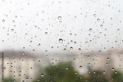 Gocce di acqua sul vetro di una finestra in un giorno di pioggia, sfondo sfocato grigio beige e verde
