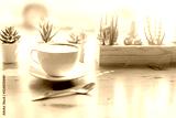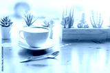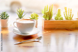 latte coffee in a classic white coffee cup decoration with cactus green leaf