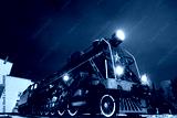 Old black steam locomotive on railway station at night