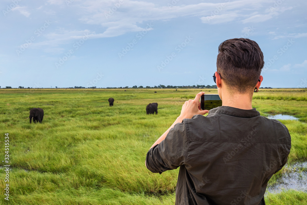 Tourist films elephants with a smartphone in Chobe National Park, Botswana
