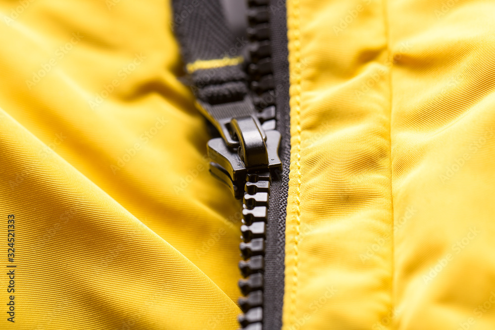 Zipper on clothes close-up. black color. Bright yellow jacket