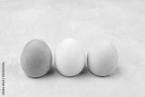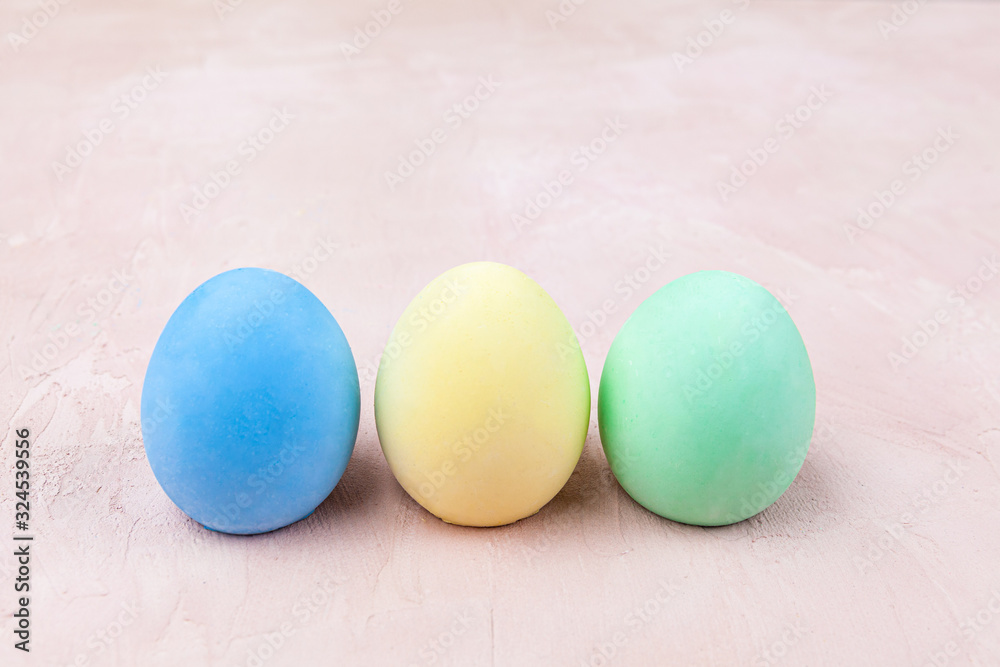 Closeup view of three Easter eggs painted in plain colors on pink background - shallow focus with copy space