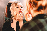 Young woman using lip pencil while drawing contours applying lipstick doing make up at home getting ready to go out