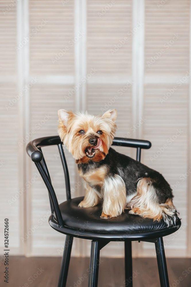 Funny yorkshire terrier sitting on a chair and sticking her tongue to her nose.
