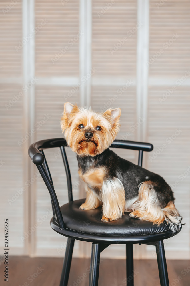 Cute yorkshire terrier girl sitting on a leather chair. Portrait view.