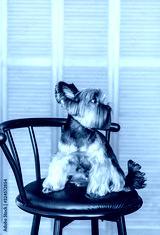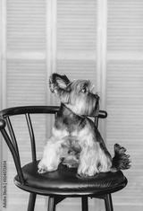 One cute yorkshire terrier in studio sitting on wooden chair and looking away.