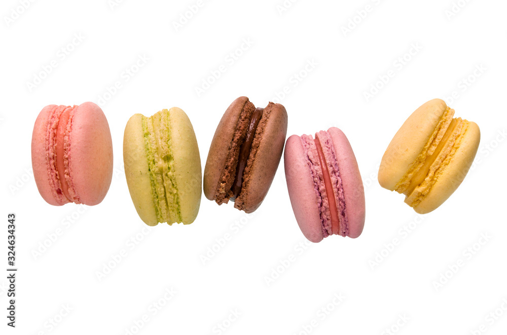 Cakes color macarons isolated on white background.