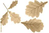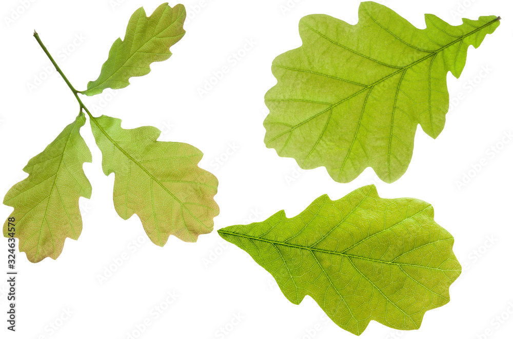 Oak leaf isolated on white background. Set of green fresh leaves oak tree on a branch and single