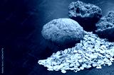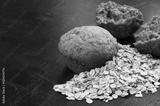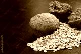 Oatmeal cake and oat grain on dark stone table background, copy space