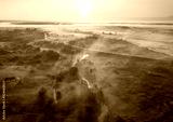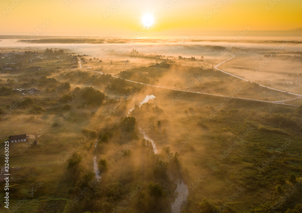 Sunset aerial atmospheric view on river in Ural Russia. Drone photography