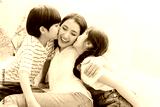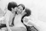 Lovely happy Asian family at cozy home. Son and daughter kiss mother with enjoy ,relax and playful together in bedroom. Happiness relationship and bonding of love between parent and children moment