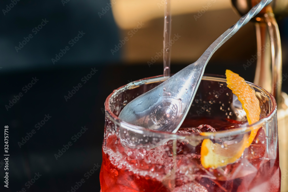 Bartender pouring liquid in a cocktail drink. Summer alcohol drink in a restaurant or bar. Barman at work.