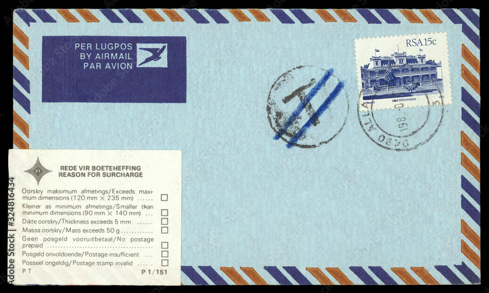 Luftpost airmail Südafrika South Africa vintage retro blau Briefumschlag envelope Umschlag frankiert Briefmarke stamp gestempelt used Matjesfontein Gebäude building blau Antilope Flügel Surcharge