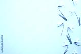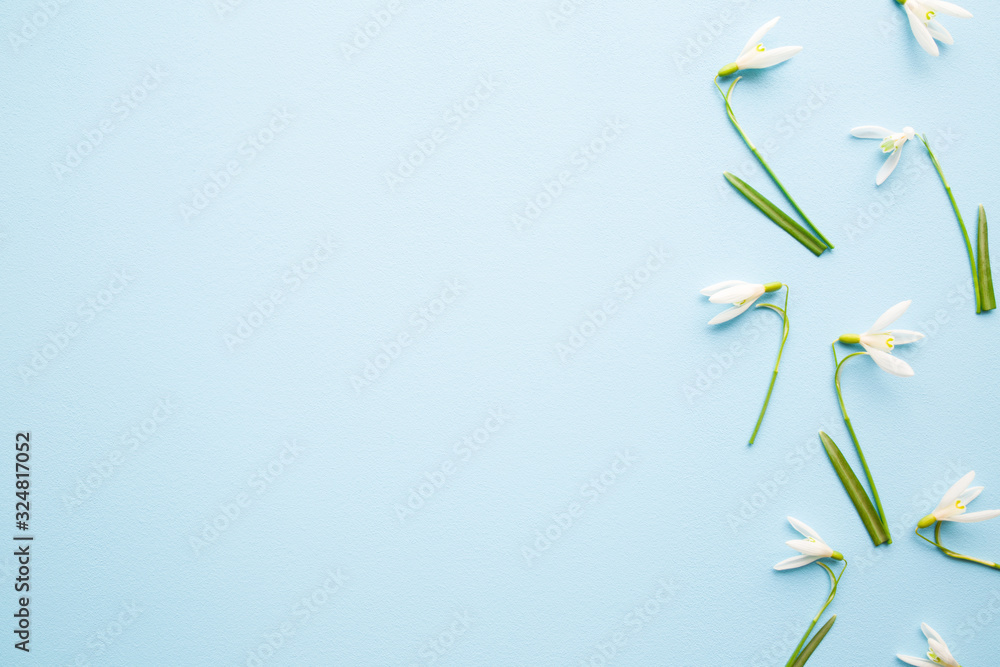 Fresh white snowdrops with green leaves. Light pastel blue table. First messengers of spring. Closeup. Empty place for inspirational, emotional, sentimental text, quote or sayings. Top down view.