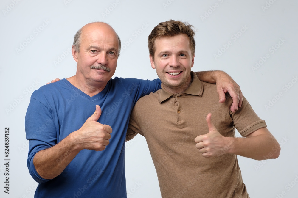 Two happy men father and son with thumbs up gesture